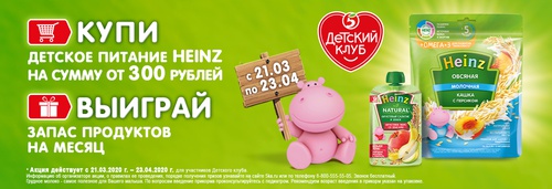 Вступай в Детский клуб «Пятерочка», купи детское питания Heinz на сумму от 300 руб. магазинах «Пятерочка», выиграй запас продуктов на месяц!