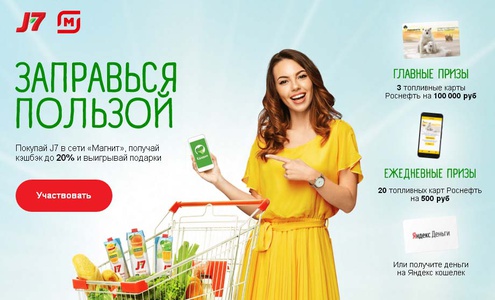 Покупай соки J7 в магазинах «Магнит», регистрируй чеки, получай кэшбэк до 20% и выигрывай подарки. Заправься пользой!