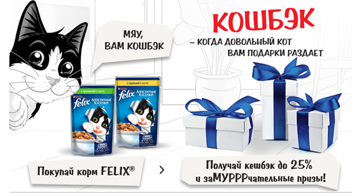 Приобретайте продукцию Felix, регистрируйте чеки на сайте акции в течении 48 часов после покупки, копите баллы и обменивайте на призы. 1 балл начисляется за каждые 20 рублей в чеке. Получайте кэшбэк до 25% и заМУРРРчательные призы!