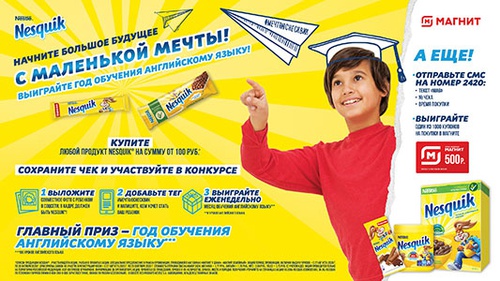 1. Купи любой продукт Nesquik в магазинах «Магнит» на сумму от 100 рублей и сохрани чек; 2. Выложи совместное фото с ребёнком и Nesquik, поставь #мечтаюснесквик (в кадре должен быть Nesquik); 3. Напиши в комментариях о том, кем мечтает стать ребёнок, когда вырастет; 4. Выиграйте еженедельно месяц обучения английскому языку. Главный приз - год обучения английскому языку. 5. Зарегистрируйте чек по номеру 2420 и выиграйте один из 1000 купонов на покупки в Магните! Сроки проведения акции: - Общий период промоакции, включая выдачу призов: с 27 августа 2020 г. по 26 октября 2020 г.; - Срок приема заявок на участие и регистрации чеков: с 27 августа 2020 по 23 сентября 2020 г.