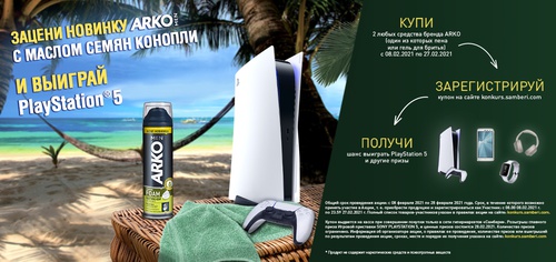 1. Купи 2 любых средства бренда ARKO (один из которыз пена или гель для бритья); 2. Зарегистрируй купон на сайте; 3. Получи шанс выиграть PlayStation 5 и другие призы.