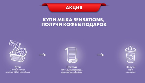 1. Купи 2 любые пачки печенья Milka Sensations; 2. Покажи чек в “Шоколаднице” или других кофейнях; 3. Получи кофе в подарок.