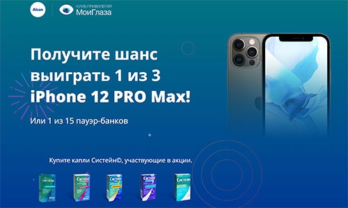 1. Купите капли Систейн, участвующие в акции; 2. Загрузите чек о покупке капель Систейн; 3. Получите дополнительно 200 баллов Клуба привилегий «МоиГлаза» и шанс выиграть 1 из 15 пауэр-банков или 1 из 3 iPhone 12 PRO Max.