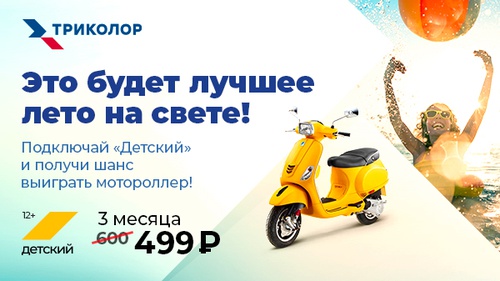 Подключай пакет каналов «Детский» по специальной цене — 499 рублей за 3 месяца — и участвуй в розыгрыше мотороллера.