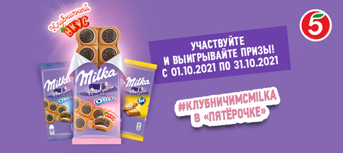 1. Покупайте шоколад с печеньем в магазинах «Пятерочка» с Выручай-картой от 2 шт.; 2. Регистрируйте чек на сайте акции; 3. Выигрывайте баллы на Выручай-карту и еженедельные призы. Продукция, участвующая в акции: - Молочный шоколад Milka с печеньем «OREO», 92 г; - Молочный шоколад Milka с печеньем «OREO» Клубничный вкус, 92 г; - Молочный шоколад Milka с солёным крекером «TUC», 87 г. Сроки проведения акции: - Общие сроки проведения Акции с 00:00:00 «01» октября 2021 года по 23:59:59 «30» ноября 2021 года (включительно); - Срок приобретения продукции и регистрации кассовых чеков: с «01» октября 2021 года по «31» октября 2021 года (включительно).