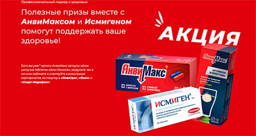 Если вы уже купили АнвиМакс капсулы и/или шипучие таблетки и/или Исмиген, загрузите чек в личном кабинете и участвуйте в розыгрыше сертификатов на покупку в «Инвитро», «Озон» и «Спорт-Марафон»!