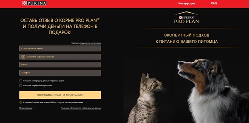 Для участия в акции необходимо: 1. Перейти на один из сайтов: https://market.yandex.ru/, https://sbermegamarket.ru/, https://www.petshop.ru/, https://irecommend.ru/, https://www.wildberries.ru/ и https://otzovik.com/ , https://www.ozon.ru/. 2. Оставить отзыв о Продукции под товарным знаком ProPlan; 3. Прикрепить ссылку на отзыв на одном из сайтов, указанных в п.3.1 в специальное окно в регистрационной форме на сайте www.purina.ru/proplanreco.