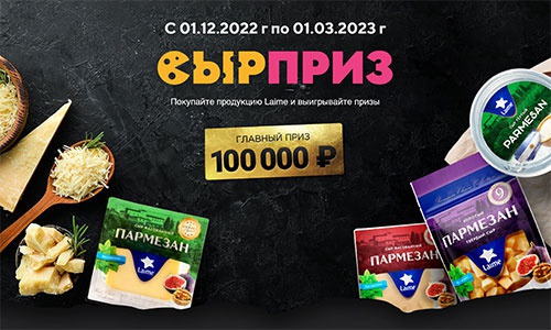 Покупайте сыры Laime, регистрируйте чек на сайте акции и участвуйте в розыгрыше призов. Главный приз - 100 000 рублей.