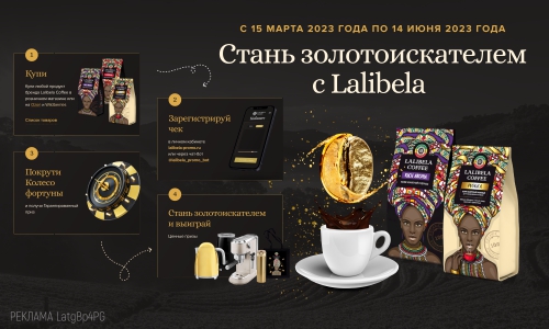 С 15 марта 2023 года участвуйте в акции от Lalibela Coffee. Покупайте продукцию, участвующую в акции, регистрируйте чеки, получайте гарантированные подарки и участвуйте в розыгрыше призов!