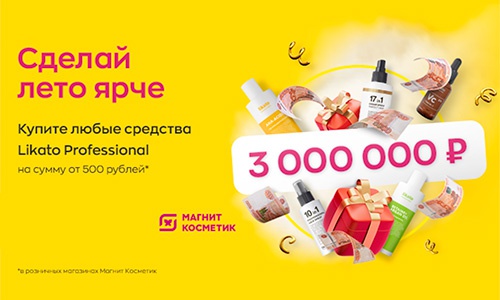 С 31 мая 2023 года участвуйте в акции от Likato. Покупайте продукцию Likato Professional в магазинах «Магнит Косметик», регистрируйте чек, получите возможность выиграть главный приз - 3 000 000 рублей и другие призы.