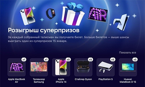 1. Выполняйте задания и получайте коробки, внутри которых могут быть элементы, из которых состоят новогодние талисманы. За каждый собранный талисман вы получите билет на розыгрыш суперпризов. 2. Для подведения итогов розыгрыша будет сформирован файл с записями обо всех участниках, которые собрали хотя бы один праздничный талисман. На его основе генератор случайных чисел выберет победителей. Сроки проведения акции: - Общий срок проведения Акции — с 13 декабря 2023 года по 15 января 2024 года (включительно); - Срок выполнения условий Акции — с 13 декабря 2023 года по 15:59 15 января 2024 года (включительно).
