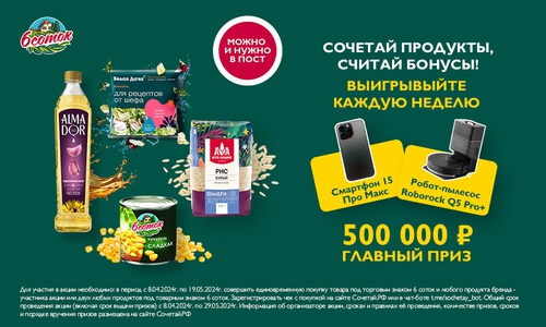 1. Покупайте продукцию 6 Соток с любым продуктом-участником акции в любом магазине или два любых продукта под товарным знаком 6 Соток; 2. Зарегистрируйте чек на сайте акции или в чат-бот @sochetay_bot; 3. Получайте кэшбек 100 руб. на телефон за каждый зарегистрированный чек; 4. Выигрывайте призы каждую неделю. Главный приз - 500 000 рублей. *В акции принимает участие товары под брендом «6 СОТОК» и продукцией под товарными знаками «Агро-Альянс», «ALMADOR» и «Белая Дача». Полный список товаров, участвующих в акции, представленных в полных правилах акции. Сроки проведения акции: - Общий срок проведения Акции: с «08» апреля 2024 года по «29» мая 2024 года по московскому времени, включая период выдачи Призов Победителям; - Период совершения покупок Продукции и регистрации Чеков на Сайте или в Чат-боте с 00 час 00 мин 00 сек «08» апреля 2024 года по 23 час 59 мин 59 сек «19» мая 2024 года включительно по московскому времени; Также акцию можно найти: 6 соток, шесть соток, агро-альянс, альмадор, белая дача, розыгрыш, призы, подарки, акции 2024, акции в апреле 2024